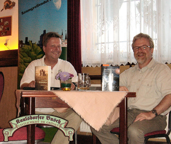 Stefan Jahnke mit seinem Buch "Birkfalken" lief in Hochform auf, als hätte er nur darauf gewartet, mit viel Sachkenntnis und interessanten Belegen, Vermutungen und Nachweisen, seine Sicht einer spannenden Geschichte über Jesus, die Templer und das Kreuz der Birken darstellen zu können. Klar, war ja seine Lesung! Erstaunlich, mit welchen Fragen die Zuhörer ihr Interesse bekundeten und den Buchautor zu immer neuen interessanten Details anspornten ...