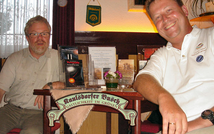 Zuerst bauten wir einen Ständer unter dem aufgespannten Fallschirm auf. Doch es fing ordentlich zu wehen an. Wir gingen in das Kaminzimmer, bauten dort alles auf. Und weil trotz... einer ...lauten Ansage, niemand kam, fingen wir an zu fachsimpeln. Das musste doch einige angezogen haben. Und nun konnte es losgehen. Stefan Jahnke warf seine Thesen zum Birkenkreuz, den Aposteln Petrus und Paulus und... den ...Merowingern in die Runde. Erstaunen und auch Widerspruch wurden geäußert.
