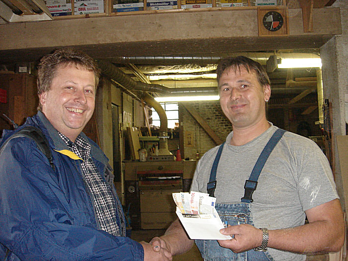 Buchautor Stefan Jahnke übergibt Tischlermeister Steudtner die Bar-Spende